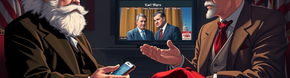 “Fascinating,” he mutters. “The opiate of the masses has upgraded from religion to reality television. The workers cheer a billionaire who promises to defend them from…other workers. MAGA, you say? False consciousness in a baseball cap. The proletariat rallies behind a landlord who would happily charge them rent for the air.”