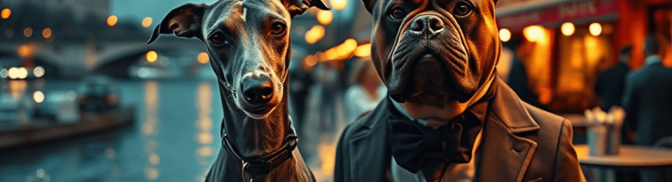 I watched one such spectacle last week in the Jardin des Tuileries. A woman of impeccable breeding, cashmere, cheekbones, and the faint aroma of expensive regret was being towed by a greyhound and a bully cross that looked like it had lost a fight with a sofa and won. The greyhound floated like a sigh; the bully marched like a small coup d’état. Passers-by smiled the special smile reserved for other people’s folly. The woman caught my eye, lifted one perfectly arched brow, and said, in the accent of someone who has read too much Colette and not enough warning labels: